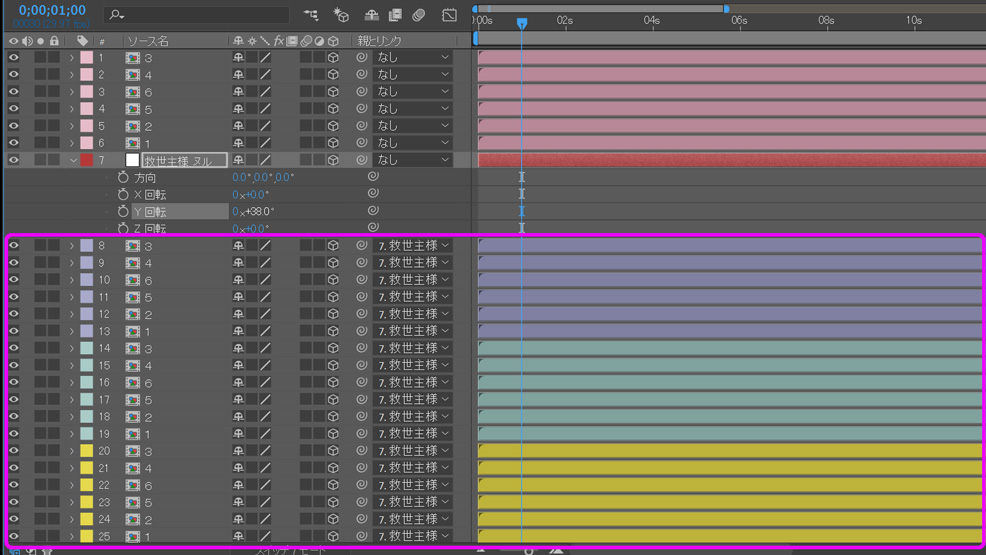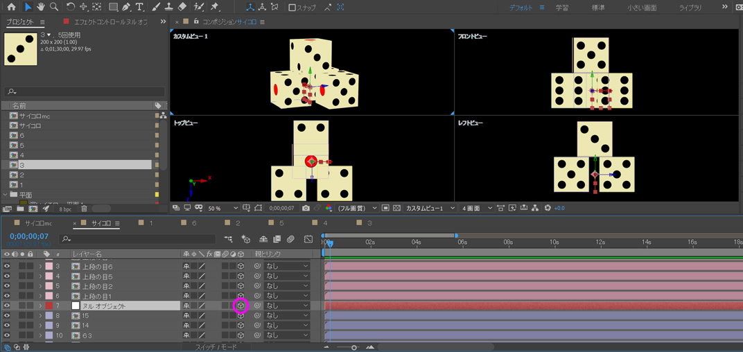 ピンク枠で囲ったのが3つのサイコロの平面。レイヤー7のヌルを親に持つ子供たち、いえ、従順なシモベたちですから、親の命令には背かれません。親が回転すれば、それに従って一斉に回転。