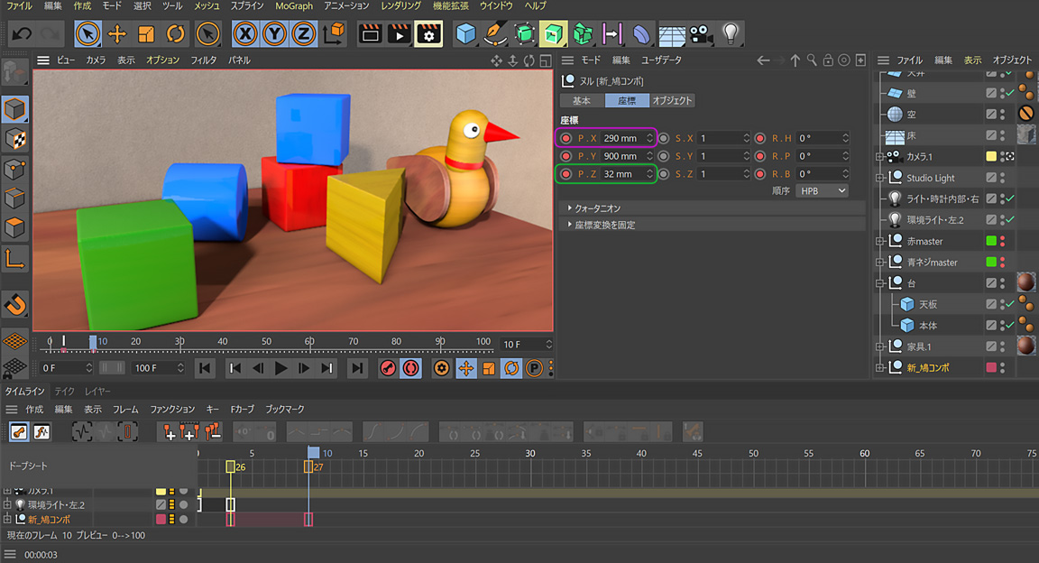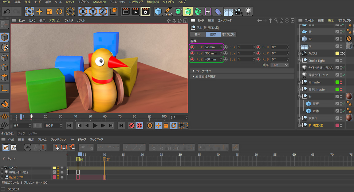 P.Xが『52mm』から『290mm』に。P.Zが『-80mm』からプラス方向『32mm』に変化しました。ようするにハトのオブジェクトが右(P.X)へ 238mm(23.8cm)動いて、壁の方に 5.2cm下がったのです。まさに机の上の物体を移動させる、そのものです。