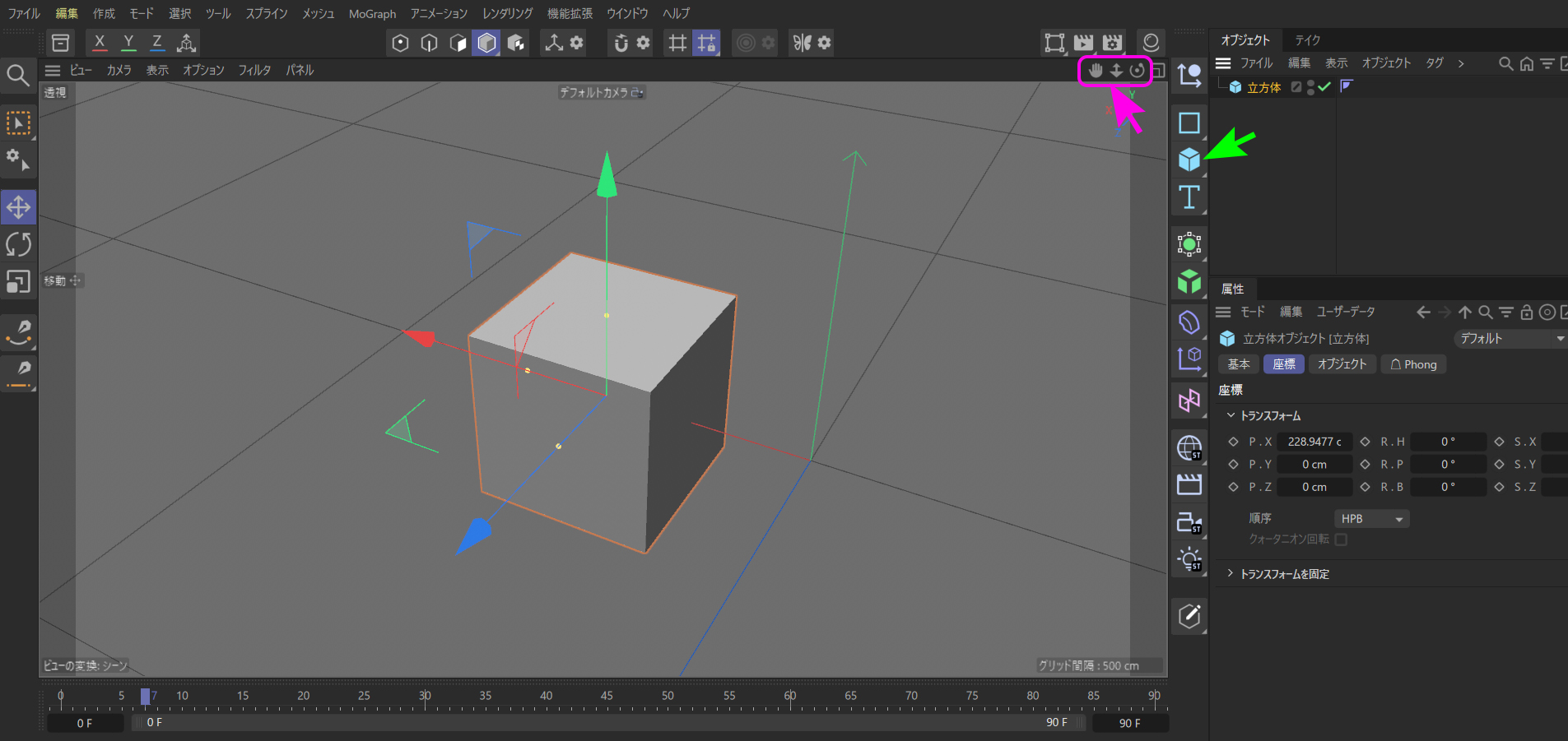 下の写真は仮想の 3D空間に置かれた立方体がエディタビューに映し出された状態です。ピンク色で囲んである部分がそのアイコン類になります。
