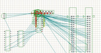 上記の写真はネットリストを読み込んだ直後のもので、中央部に部品が重なって表示されている。したがって部品どうしがぶつかっているというエラーが出て赤くなっている。そして緑の細い線がラッツネストだ。これは部品をどこへ移動しても、あるいは回転をしてもゾロゾロ付いてくる。ラッツネストが示しているところが接続先となっている。