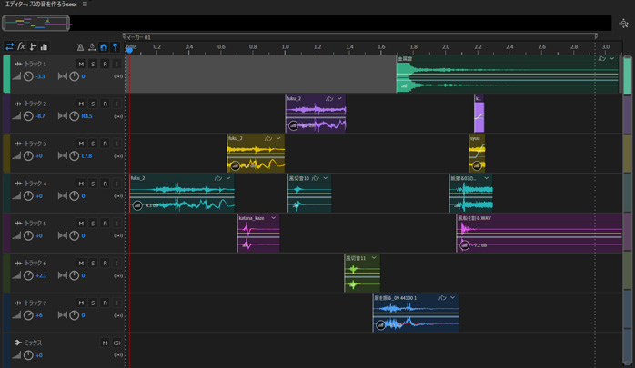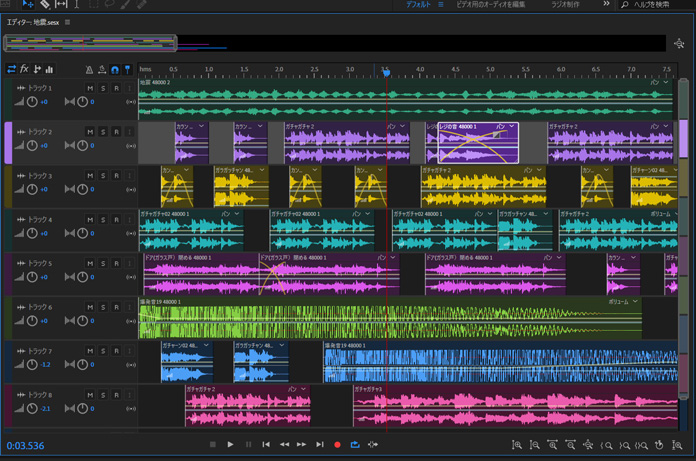 時代劇の音のときもそうでしたが、効果音は一つの音だけでなく複数の音を混ぜて作ることが意外と多いのです。そして重要なのは、個々の発音タイミングです。ほんの少しずれるだけで音の品質に影響します。そこで登場するのがマルチトラック編集です。Auditionではそれを可能にしてくれます。