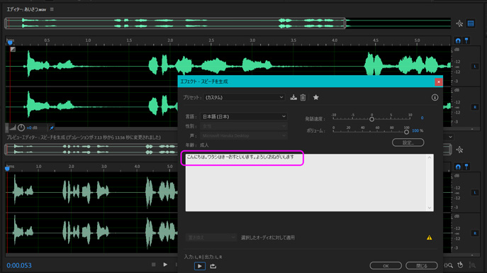 ウィンドウメニューから【エフェクト】→【生成】→【スピーチ】です。出てきたパネルに日本語を打つと、そのまま喋ってくれる機能です。設定の中に男性と女性があるのですが、Windows版では女性だけのようで男性には切り替わりませんでした。