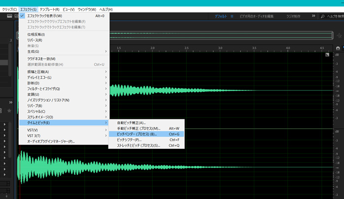 ウィンドウメニューから【エフェクト】→【タイムとピッチ】→【ピッチベンダー】です。