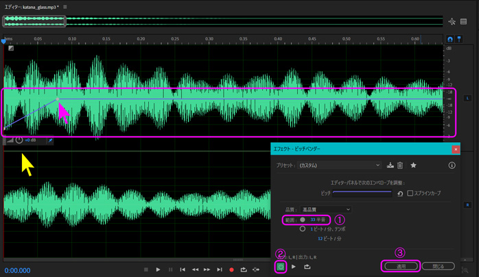 原音は【1】のフライパンがきつく擦れる『シャッ』と鳴る耳障りな部分と、【2】のコップが『キーン』と響く部分を合わせたものに、ビッチベンダーというエフェクトを掛けます。