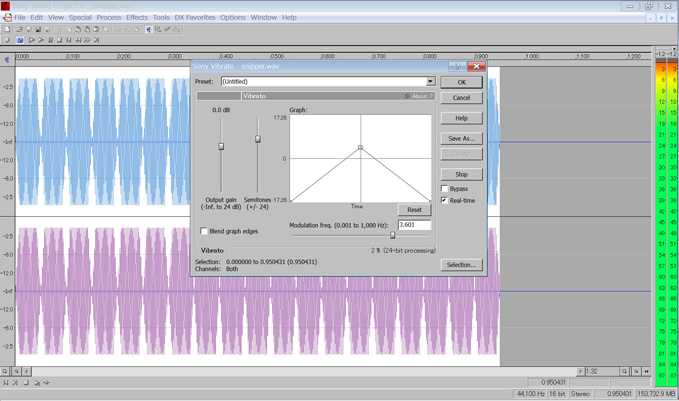 SoundForgeにはまだ面白エフェクトがあって、音を指定した間隔で細切れにする【Sipper】や、細切れにした音を指定した間隔で並べ直してくれる【Gapper】などがあります。また任意の形のとおりにピッチを上げ下げしたものを指定周期で繰り返す【Vibrato】などはいまだに使えます。