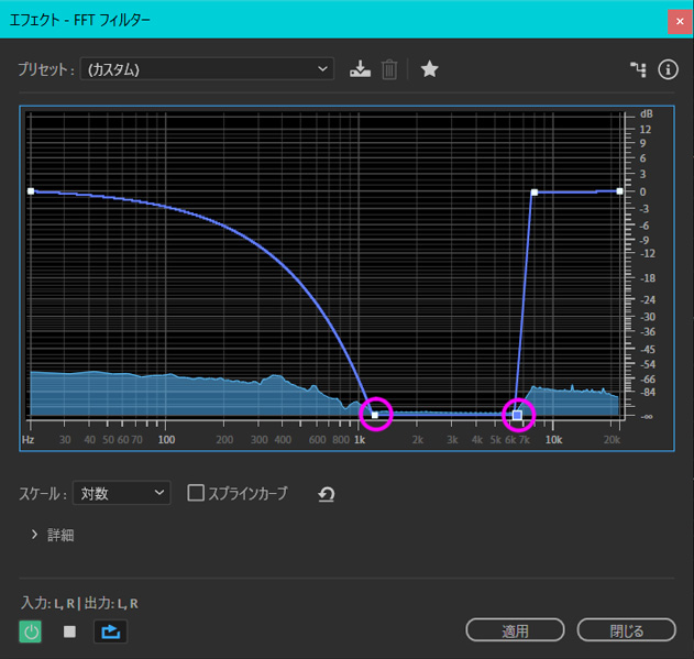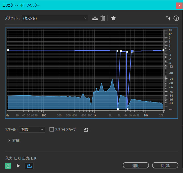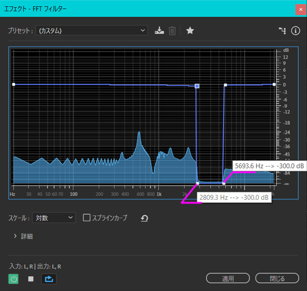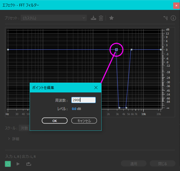 この状態で少しでもポイントを動かすと『ピィー』音が鳴りだします。つまり、2.9kHz周辺と 4.4KHz辺りに『ピィー』の音成分があることが分かりました。この部分だけレベルを最低にして適用すると、
