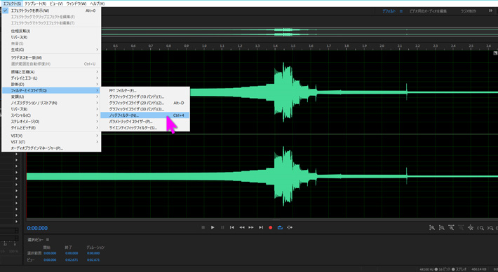 Auditionには 数多くのフィルターやノイズリダクション処理があります。『シャー』というヒスノイズは【ヒスノイズ除去】や【ハンマーノイズ除去】、『ブーン』とうなる機械音などは【クロマノイズ除去】などを使うと驚くほどにきれいさっぱりと消し去ってくれます。これらはウインドウメニューの【エフェクト】→【ノイズリダクション】の中に並んでいます。