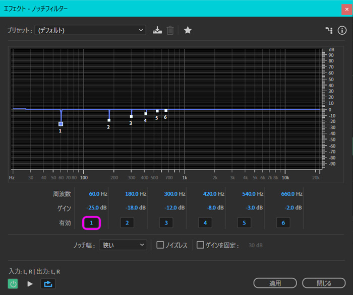 今回のように音の正体がはっきりしている場合は【ノッチフィルター】が便利です。