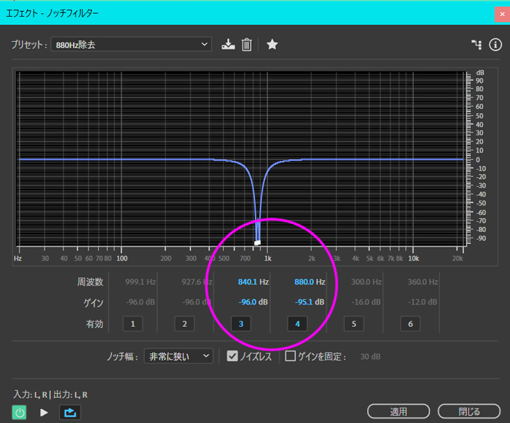 ループ再生にして音を鳴らしながらポイントを調整するとより操作しやすいです。あるところで急激に『ポォー』の音が消える場所があります。予想どおり 840Hz周辺から 880Hzをターゲットにしたときに消えました。そこで適用ボタンを押すと、