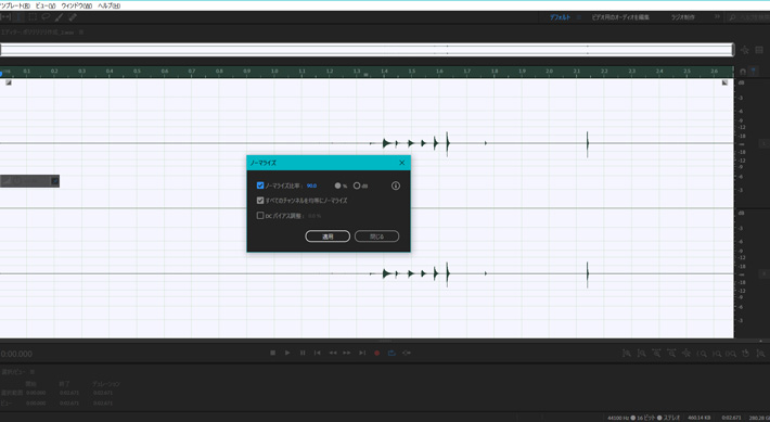 このままでは音が小さいのと無駄な無音が目立ちますので、ノーマライズで音割れ直前の 0dBの90%まで上げて必要な部分だけに整理します。
