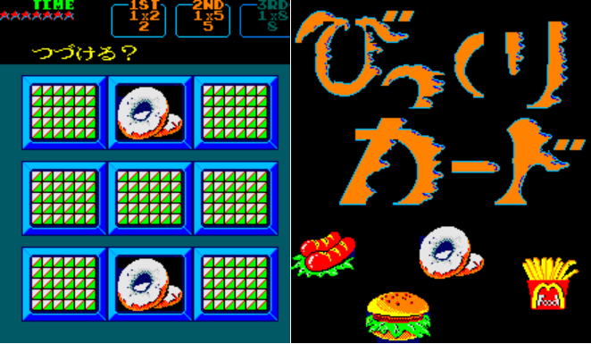 同じ基板によるプライズゲーム。 9枚のカードのどれか2枚を捲って、同じなら景品払い出し。 Kさんの情報によりますとビックリカードもmame対応済だそうです。下記アドレスで見れます。 http://adb.arcadeitalia.net/dettaglio_mame.php?game_name=bikkuric&search_id ShortPlayボタンを押すと実際に動いている状態で見ることができます。 またROM内の隠しメッセージまで見つけられていました。これはさすがに作った側としてはハズイですね。 https://tcrf.net/Bikkuri_Card