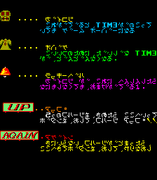 (これも記憶にありませんので、資料のとおりに書き写します) Round方式のアドベンチャーゲーム。 RJP方式に加えてRESET RJPの追加による複雑なキャラ、多種のキャラを少ないメモリで処理できるシステムを完成。 (カッコいい書き方をしていますが、ようはテーブルジャンプのジャンプ先をゲームの進み具合で書き換えてしまうやり方で、基本のサブルーチンをそのまま使えるために省メモリが可能になります)