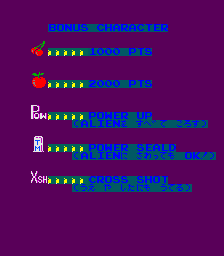 0xB010:Y座標データ 0xB011:スプライトキャラ選択 | 0xB03E:Y座標データ 0xB03E:スプライトキャラ選択 0xB410:スプライトキャラの色選択(bit0~5)キャラの向き(bit6,7) 0xB411:X座標データ | 0xB43E:スプライトキャラの色選択(bit0~5)キャラの向き(bit6,7) 0xB43F:X座標データ |