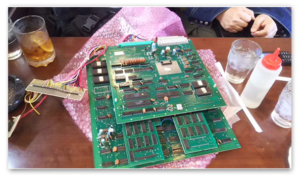 K氏とS氏がわざわざ横浜からお持ちいただいたゲーム基板もその中の一つ。Time Pilotをベースにした『Fruits Up』でした。