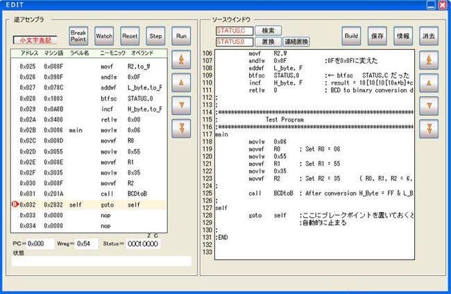 ソースプログラムウインドウにプログラムをキーボードから入力して〝Build〟ボタンを押すとアセンブルされて隣の逆アセンブルウインドウに表示される。