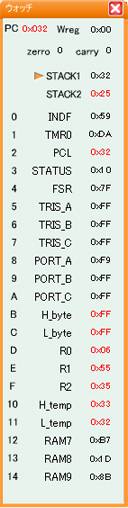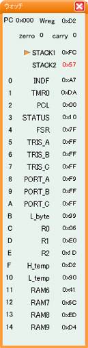 間接アドレッシング、CALL命令、RETLW命令も動き出したし、入出力ポートもアクセス可能になったので、プログラム次第ではマイクロスイッチの検知もできる。