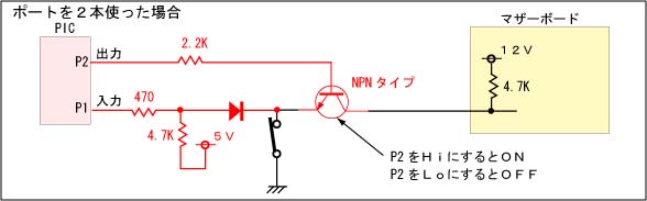 まず、5V系の負論理で1本のポートでスイッチを読み込んだり、同じポートを出力端子に切り換えてマザーボードにスイッチが押されたように見せかける回路から。(赤い部分が追加回路)