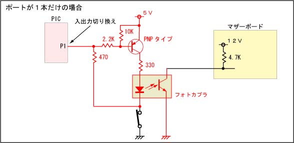 P1をLoに落とせばトランジスタがONになりフォトカプラもONで、スイッチを放した擬似信号がマザーボードに伝わる。