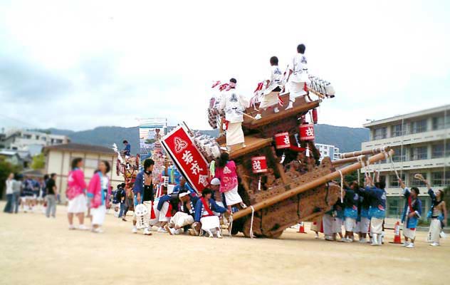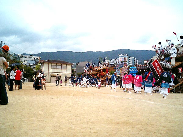 お昼頃。太鼓の音が鳴り出した。どうやら〝だんじり〟の暖機運転(?)が始まったみたい。本格的に町内へ繰り出す前に、小学校の運動場で始まりをアピールする。