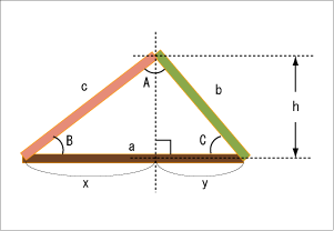 せめて高さの〝h〟だけでも分かれば、三角関数で角度〝B〟や〝C〟が求まるから、その角度まで両端の棒が倒れるスクリプトを書けばよいが・・・。それか〝x〟が分かれば三平方の定理(ピタゴラスの定理)で〝h〟が出てくるけど・・・・・。 ここで悩むこと半日。