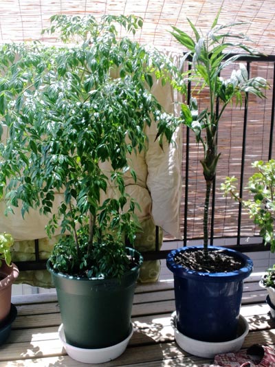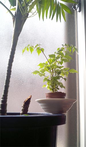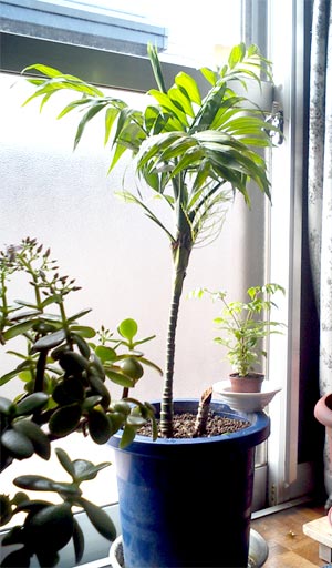 テーブル椰子のフチにチョコンと載っていたのが、いまや特大の植木鉢に入れ替え、高さもベランダの手すりを超えてしまった。もう樹木といっていいかもね。
