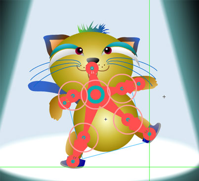 ボーンツールのボタンを押してから、各パーツ(ムービークリップにしておくことが必要)をマウスでドラッグしていけば、この絵のようにジョイントが作成されていく、あとはフレームの要所要所でポーズを挿入して、各パーツをマウスで回転させたり移動させて、好きな格好に仕上げるだけです。