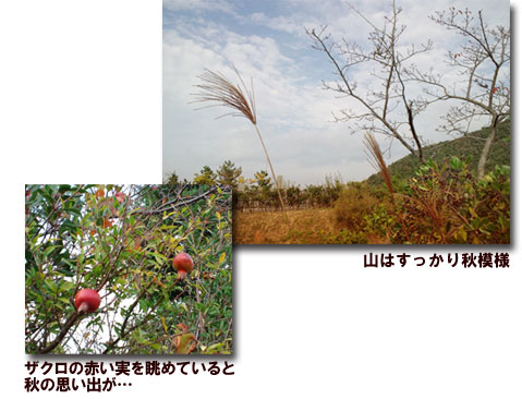 でも、霊園周辺の茂みに生るザクロの赤い実を眺めていると、イロイロと懐かしい記憶がよみがえってくるね。秋の山では食べるものが豊富に手に入ったことを・・・。