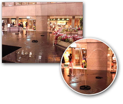 地下街の川を流れに沿って上流へ向かうと噴水のある池のような水溜りにたどり着く。この噴水もチトおもしろい。水が "シャ~"って吹き上がるのではない。なんちゅったらいいのか、"マロニー"のような噴水。