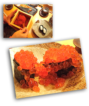 まず、イクラの乗っていない軍艦巻きが二貫出てくる。そしておもむろにイクラがたっぷり入ったデッカイ桝が登場。ようするに、イクラをシャモジ一杯ならどんな入れ方をしてもよろしおますので、どしゃっと軍艦巻きによそっておくんなはれ・・・という、大阪らしいサービス。