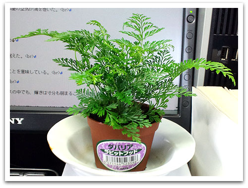 テーブルに載せる用なので、きれいなガラスのカップに入った、ぱっと広がった葉っぱが可愛く、キーボードを叩く振動で葉を揺らす愛らしい姿に見とれていました。