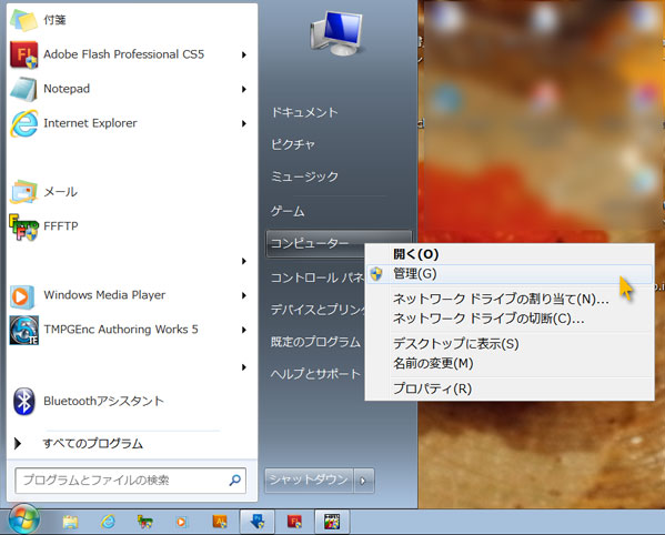 [スタート]から[コンピュータ]の上で右クリック、[管理]の欄をクリック。