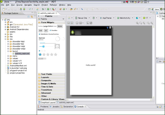 新規プロジェクトウィザードを通すだけで、基本のアプリは完成していて、"Hello world!"の一文字が表示されるところまでプログラムできている。