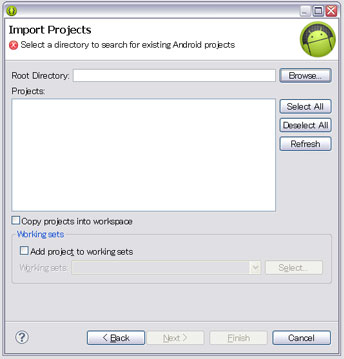 既存の「プロジェクト」は[ファイル] →[インポート]→[Select]そしてさらにそのなかから、[Android]を開いて、その中から[Project]読み込むって言うことを……。
