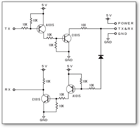 なんだか大げさなことを書いていますが、単純に受信、送信ラインを一本にして、残りをGNDと、電源線にしているだです。でも意外とこの通信線を一歩にまとめるというが、便利いいんですよ。