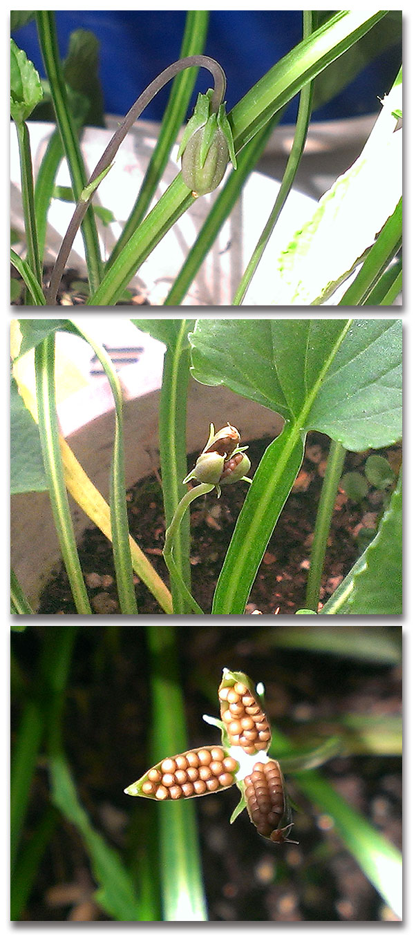 まず花が萎んだ後にできる種。アサガオでもそうですが、最終的に本体は枯れて地面に種が落ちて同じ場所、あるいはその周辺からまた芽が出るものですが、スミレの場合はもっと凝っていて、二段回のプロセスを経て行きます。
