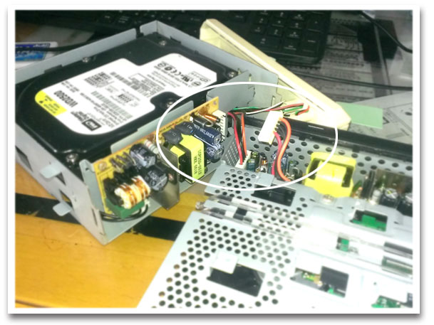 んで、考えました。今さら電源ユニットを修理しても、もう新しいディスクが手元に届いていますから、する気はありません。欲しいのは中のデータだけです。一時的にはハードディスクが動いてくれればデータの移動が可能です。