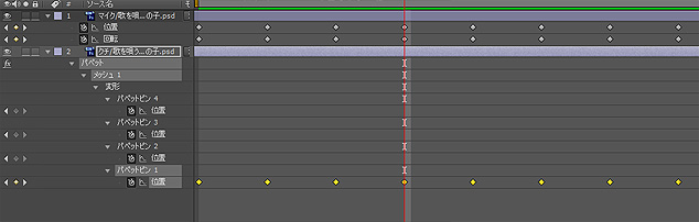 タイムライン上、黒褐色の部分に並んだ粒々がキーフレームです。その時々の変化点を表しています。