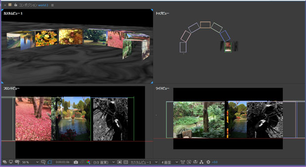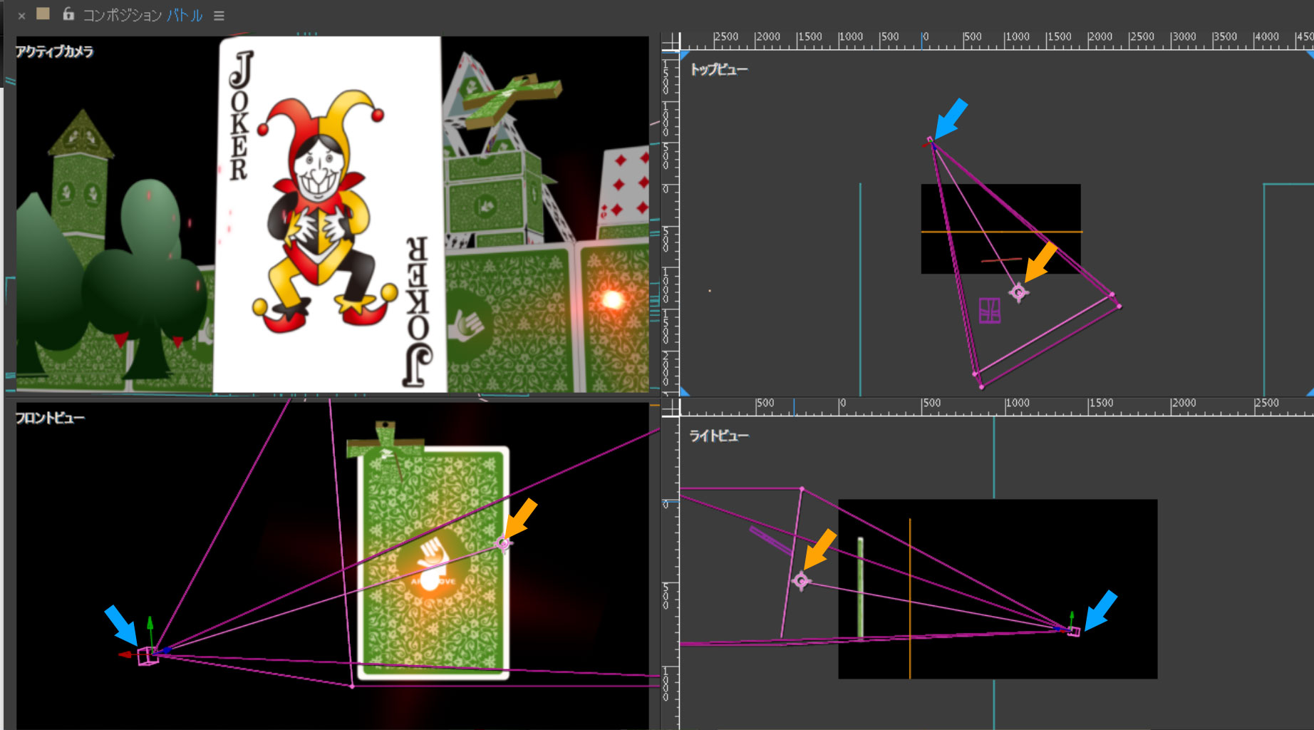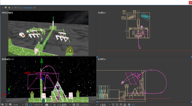 はい。気持ちいいほどサクサク動きます。前回出てきた『トランプ』を編集するときに Aeでどれだけ苦労したことか。好きな視点から俯瞰したくても画面が重くて動かないんですから大変でした。しかしC4D_Lだとグリングリン回転します。裏から真上から、はたまた真下から、どこでも自由自在です。