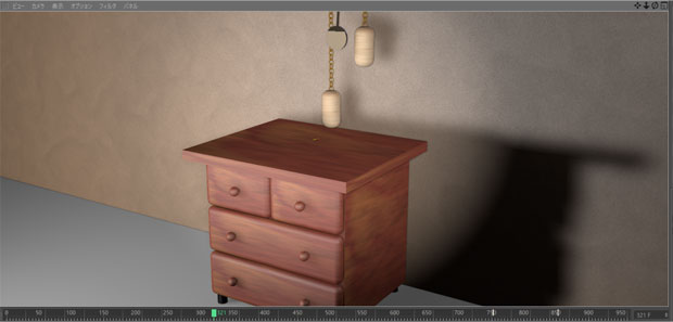 まだ慣れていないので、最終レンダリングを通すまではどのような仕上がりかよくわからないのです。静止画としてレンダリングはできますが、映り込んだ影が揺れ動く部分は動画にならないと見ることができません。