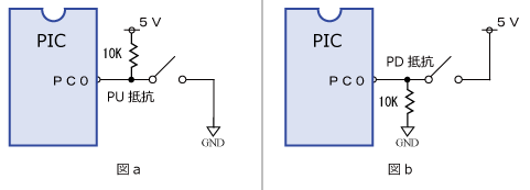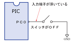 図のようにスイッチが切れている場合、通常の状態ではPICの入力端子に電圧が掛かっておらずHにもLにもならず不定になっています。このような状態がハイインピーダンスで、非常に不安定なことになっています。