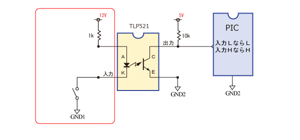 この部品の優れているところは、LED側とフォトトランジスタ側を光りで繋いでいるところです。お互い別電源で繋ぐことができますので、ノイズや電圧の変化に強い回路ができます。ただし、GNDどうしを繋いでしまうとノイズがGNDを走って、相手に伝わりますのであまり意味はなくなります。GNDが貧弱ですと基準点の電圧がフラつき、簡単にノイズが走ります。これはフォトカプラだけでなくすべての回路に言えることです。くどいようですがGNDはしっかりと…です。