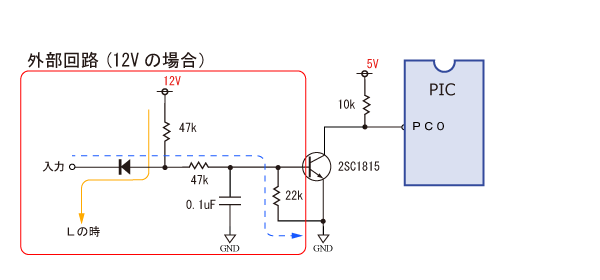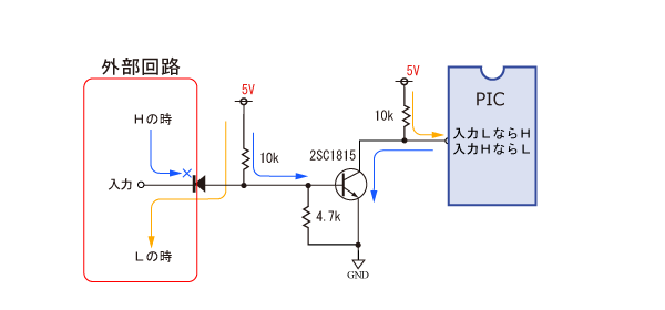 外部信号がHのとき、ダイオードがありますのでカソードで堰き止められて中には入ってきません。代わりに5Vから通常のバイアスが掛かり、トランジスタはON。するとPICはLを検知します。