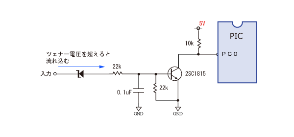 5V以下になるとツェナーダイオードはもとのダイオードに戻りますので、電流が遮断されます。電流が切れるとトランジスタはOFF(Z)になりますので、コレクタにはプルアップ抵抗の電圧が掛かり、PICにはH信号が入ります。