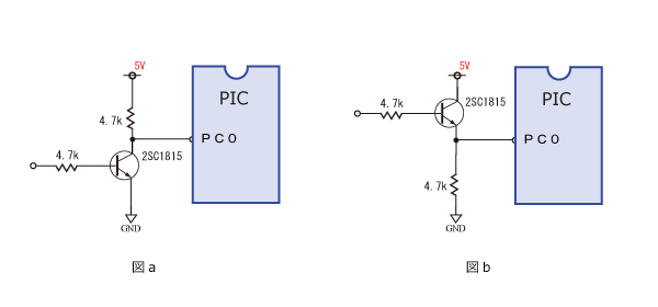 NPNトランジスタを使うと図aのプルアップ回路が本筋になります。ですので機械的なスイッチ回路なども混ざる入力回路では自然とプルアップ型が主流になります。