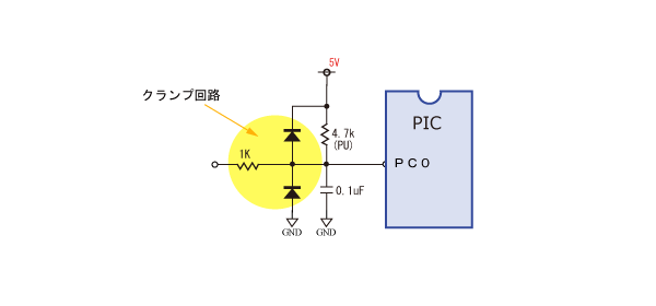 抵抗値は100Ωから10KΩほど、ダイオードは小型の小電流用です。GNDから電源に抜けるように接続したダイオードがクランプ回路と呼ばれる保護回路です。