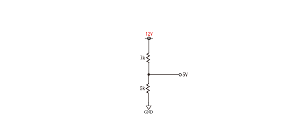 図のように1mA消費で計算して12Vを5Vにするには、7KΩと5KΩの抵抗で7Vと5Vに分圧します。