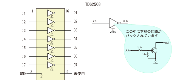 手元に転がっているとか、値段が安いとかの理由でなければ、無理してこれを使う必要はなく。飽和電圧の低いTD62502、TD62503を使用したほうがいいと思います。