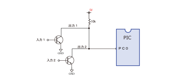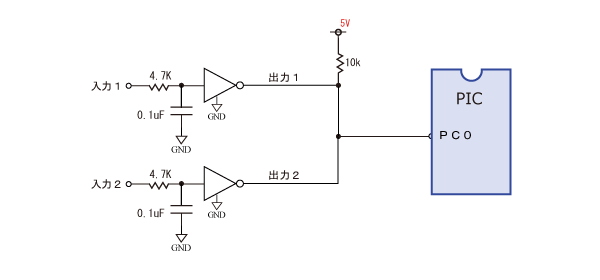 入力1と入力2があって、出力は1本にまとめられてプルアップ抵抗で5Vに吊り上げてPICの入力に接続しています。