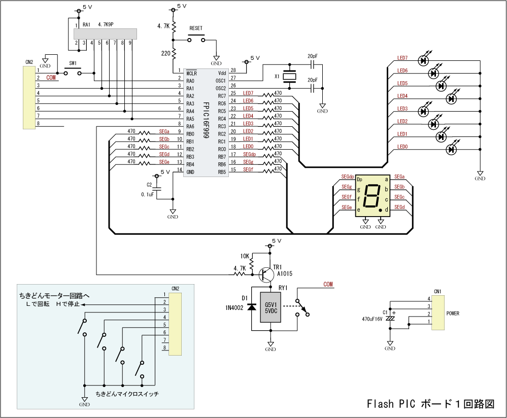 これで、Flash PICのボード1の説明はだいたい終わりました。次回は少しプログラム側の話。これも避けては通れない、2進数とビットの説明に入ります。